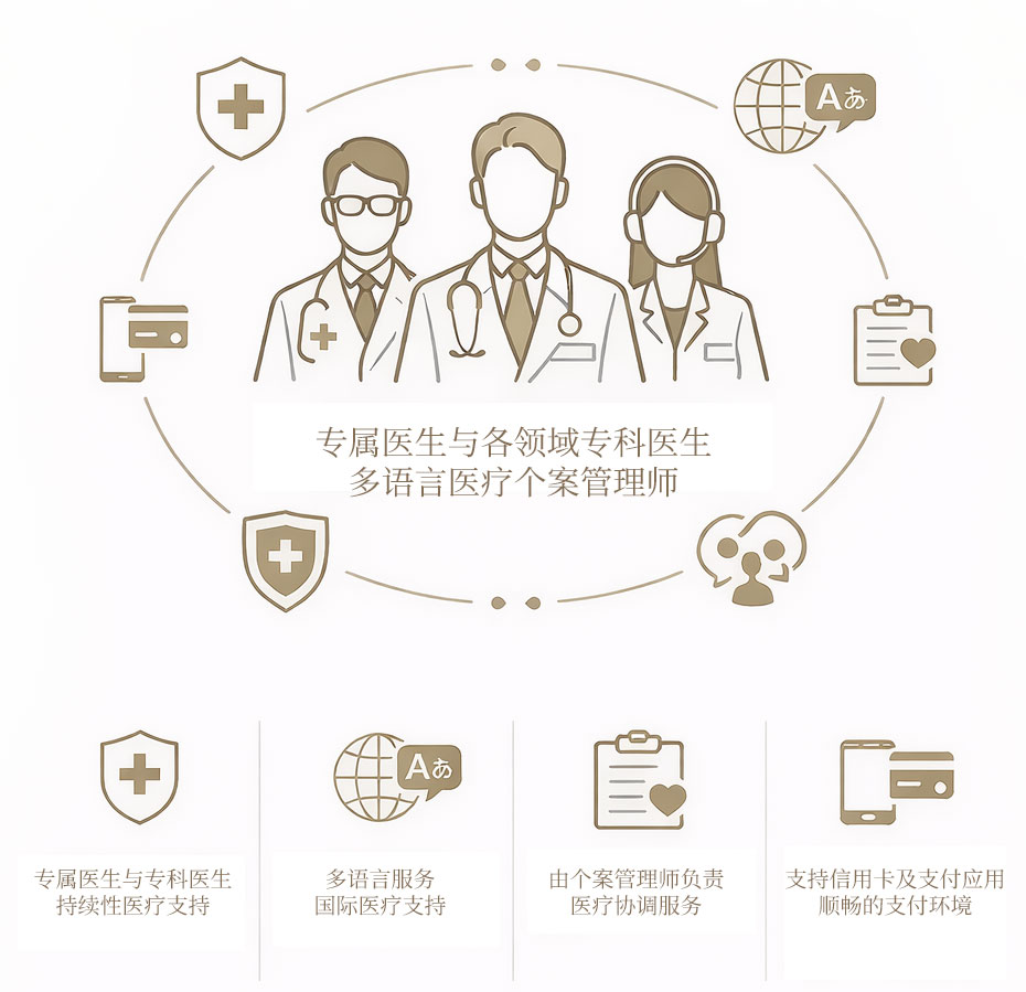 作为国际VIP医疗支持服务,我们不仅提供主治医生与专业医生的持续医疗支援,还配备多语言医疗翻译及协调服务,并支持国际信用卡及多种支付方式,营造舒适便捷的就医环境。